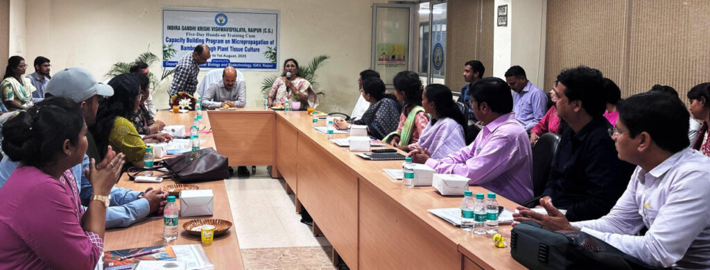 इंदिरा गांधी कृषि विश्वविद्यालय रायपुर के आणविक जीवविज्ञान एवं जैव प्रौद्योगिकी विभाग में आयोजित पाँच दिवसीय “बाँस के टिशू कल्चर के माध्यम से सूक्ष्म प्रजनन पर क्षमता निर्माण प्रशिक्षण कार्यक्रम” का आज यहां समापन हुआ। समापन समारोह के मुख्य अतिथि इंदिरा गांधी कृषि विश्वविद्यालय के कुलपति डॉ. गिरीश चंदेल थे। समारोह की अध्यक्षता कृषि महाविद्यालय रायपुर की अधिष्ठाता डॉ आरती गुहे ने की।